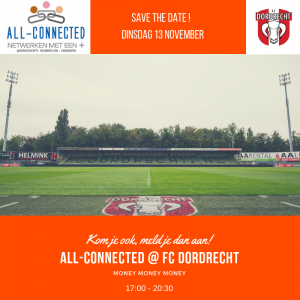 All-Connected, netwerken met een + organiseerd een event bij FC Dordrecht zoals u van ons gewend bent met als topic “FINANCIERINGEN” de meest gebruikte zoekterm onder MKB bedrijven op het moment. Om onze onpartijdigheid te kunnen waarborgen hebben wij verschillende instanties welke verschillende soorten financieringen bieden uitgenodigd om jou te kunnen informeren. Het een en ander wordt aan elkaar gepraat door Joris Lutz.